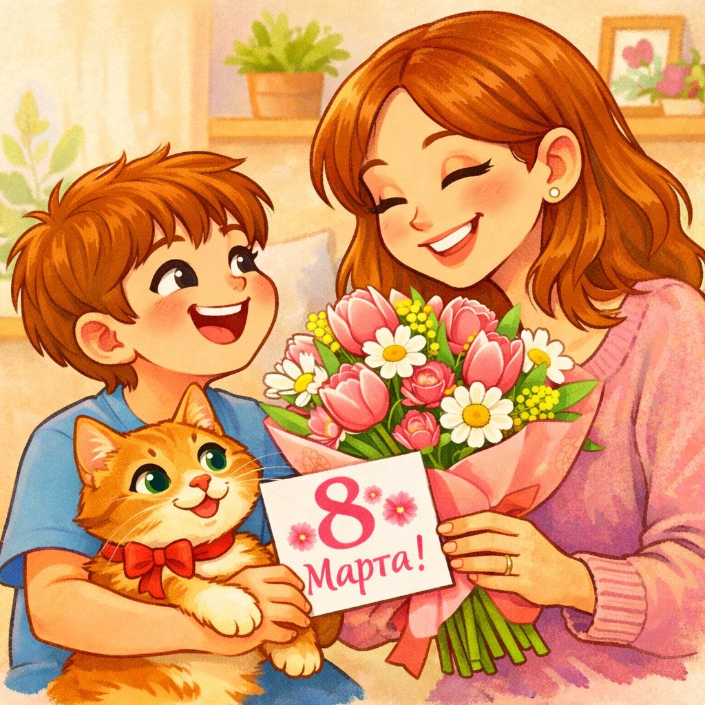 В одном маленьком, уютном городке жил-был мальчик по имени Гоша. У него был замечательный котик по имени Палёнка, который всегда сопровождал его в приключениях. Гоша очень любил свою маму и хотел сделать ей особенный подарок к Международному женскому дню 8 марта.