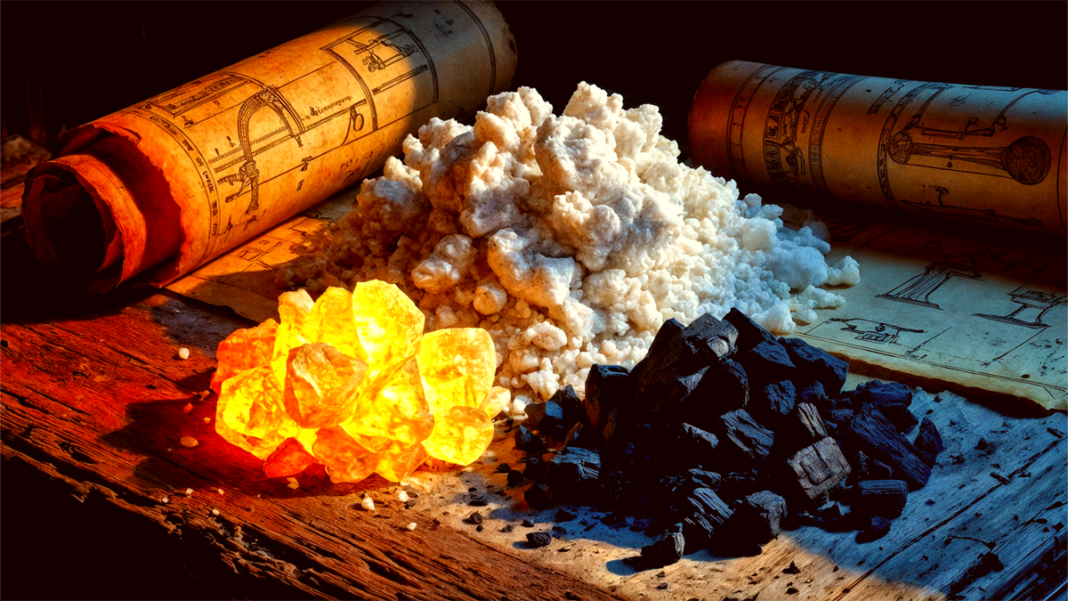 Селитра. В Китае её называли «снег из земли» и «огонь-трава». Она была повсюду в почве, её даже использовали вместо соли. Ключевое свойство: при горении выделяет кислород. Это как подкинуть в костёр ведро бензина.