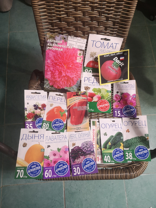 Два томата и редис куплены по 10 рублей на распродаже. В прошлом году покупала по 5 рублей цветы с истекающим сроком годности, все взошли. Редис решила посеять ради интереса на продажу, первая редиска у нас пользуется спросом. Не, ну а что? 10 рублей это ни о чем, зато попробую, вдруг что получится. У помидор, как правило даже просроченные семена всходят. Пусть будет. Посажу по одному семечку посмотреть, что за сорта. Оранжевый перец взяла из-за срока ожидания - скороспелка. А Бизон из-за описания (я на золотые горы тоже ведусь), вот и посмотрим - посажу по 3 семечка, остальное на следующий год оставлю. Аквилегию сама не знаю, зачем взяла. Посею, взойдет - хорошо, если нет, ну и ладно. На портулак сама себя уговорила. Надо местами под розами брешь заполнить. Это будет третья попытка выращивания портулака, первые две разочаровали. Дыни у меня своей валом, но решила эти семена взять из-за скороспелости, посмотрим. Дыня лишней точно не будет. Иберис однолетний планировала попробовать, лаватеру тоже. Я ее на площадке заказала, но там цена в 5 раз выше, поэтому откажусь. Огурцы взяла дополнительно из-за того, что у меня рассаду просили, но я решила пойти дальше - вырастить на продажу.... Все прекрасно в моей идеи кроме одного - я совершенно не умею продавать))))