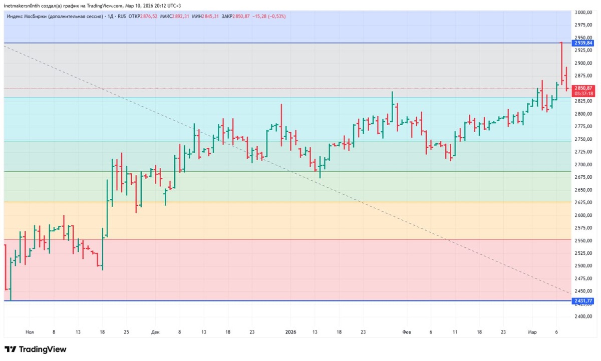 ❗️10 марта российский фондовый рынок ушел вниз, индекс МосБиржи подешевел на 1,21% до уровня 2853,86