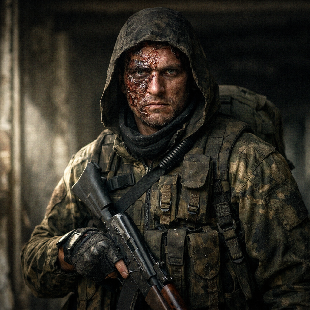 Из тени вышел человек в военной форме. Его лицо было покрыто шрамами, а в глазах горел странный огонь.