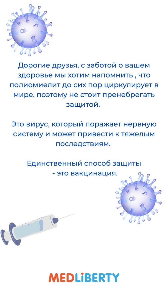 Дорогие друзья, с заботой о вашем здоровье мы хотим напомнить , что полиомиелит до сих пор циркулирует в мире, поэтому не стоит пренебрегать защитой! 💉