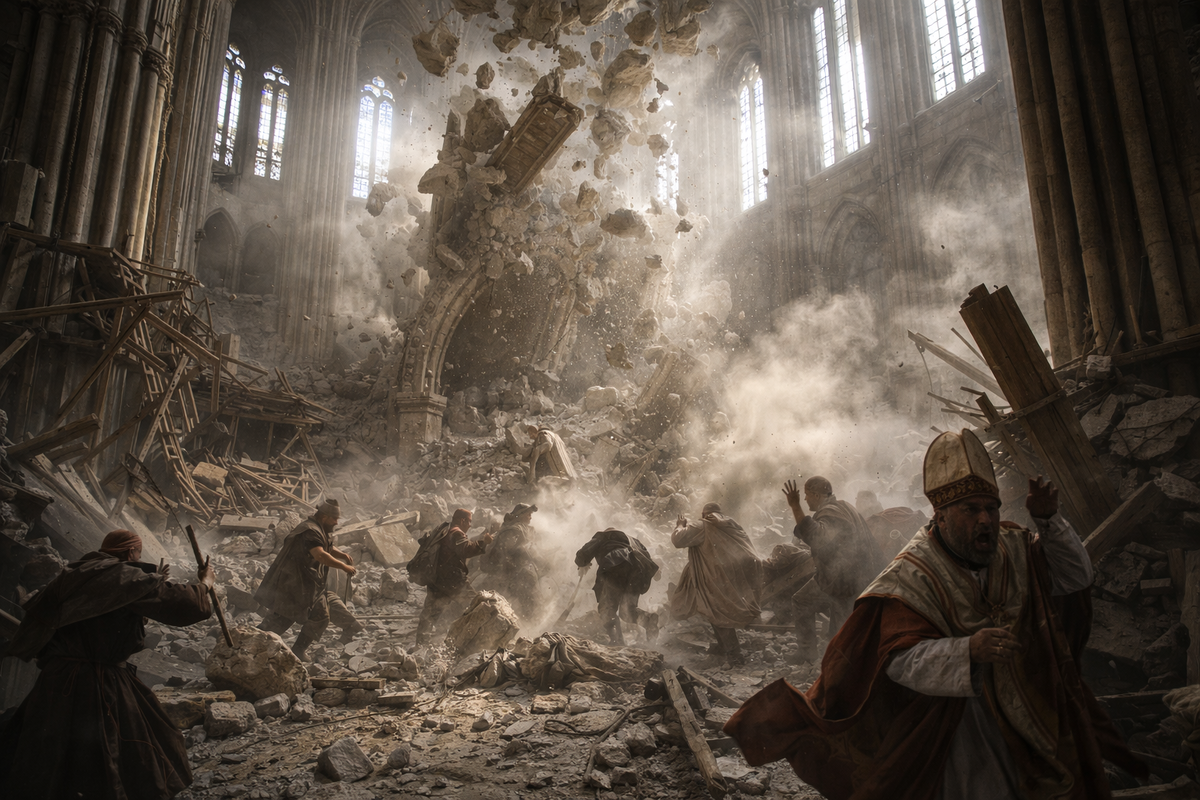В 1284 году хор Бовезского собора рухнул. Не во время землетрясения. Не от пожара. Просто рухнул — через двенадцать лет после завершения строительства. Своды высотой 48 метров, рекорд готической архитектуры, не выдержали собственного веса. Погибших, судя по хроникам, было немного — успели эвакуировать. Но сам факт катастрофы поставил перед епископом Бове вопрос, который в учебниках истории обычно не звучит: а где теперь найти людей, которые это починят?