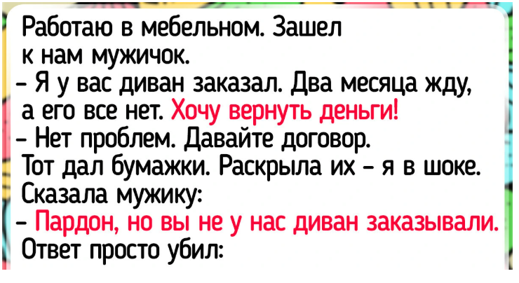 — Пардон, но вы не у нас диван заказывали. Не в нашем магазине и даже не в нашей фирме.