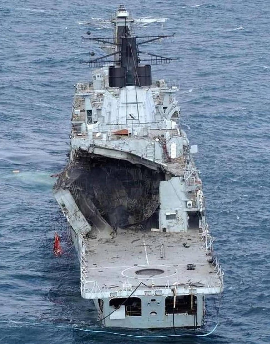 По нему отработали двумя противокорабельными ракетами «Гарпун». Это американские дозвуковые ракеты с массой боевой части около 220 килограммов. Две такие — серьёзный аргумент даже для корабля покрупнее.