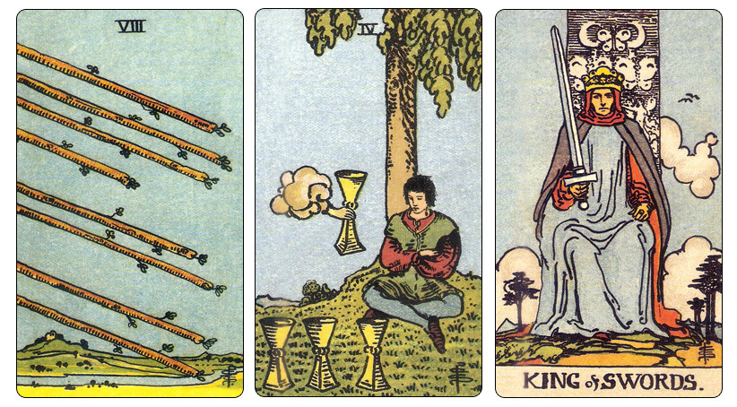 Восьмерка Жезлов – это рост, движение вперед, прогресс. Позитивная во всех смыслах карта, но важно, в каком окружении она выпадает в раскладе. От этого зависит конечные исход дела. Посмотрим на примерах сейчас. Вот, предположим, такой у нас расклад: Восьмерка Жезлов, Четверка Кубков, Король Мечей И вопрос, скажем, такой: «Найду ли я работу получше в ближайшие полгода?» Что тут можно сказать? По Восьмерке Жезлов предложения будут, пожалуй, даже несколько предложений. Несколько, это потому что Восьмерка Жезлов – активная очень карта. Вот был бы Туз Жезлов это было б одно предложение. Во всяком случае одно достойное рассмотрения. По Двойке Жезлов тоже предложений немного, возможно, одно. А вот по Восьмерке Жезлов, если именно про стоящие предложения говорить, то тут точно больше одного варианта. Но ни один из этих вариантов спрашивающего в полной мере не устроим – Четверка Кубков. Так себе, хотелось бы лучше. По Королю Мечей не очень-то будет доволен. Мечи – это масть борьбы. Король Мече