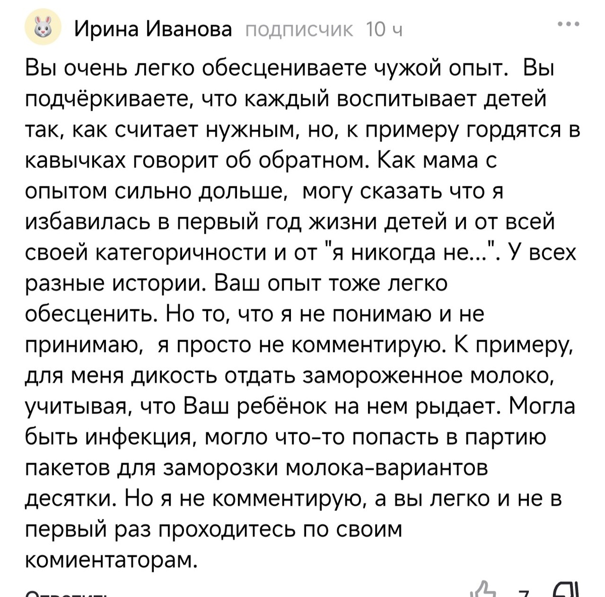 Что мы узнали из комментария Ирины Ивановой? Что она "не комментирует" и "ее опыт сильно больше"? Это как? Один ребенок или 10? Или ни одного и она про своих родственников говорит? Этого мы не знаем. Зато осудить меня с удовольствием :)