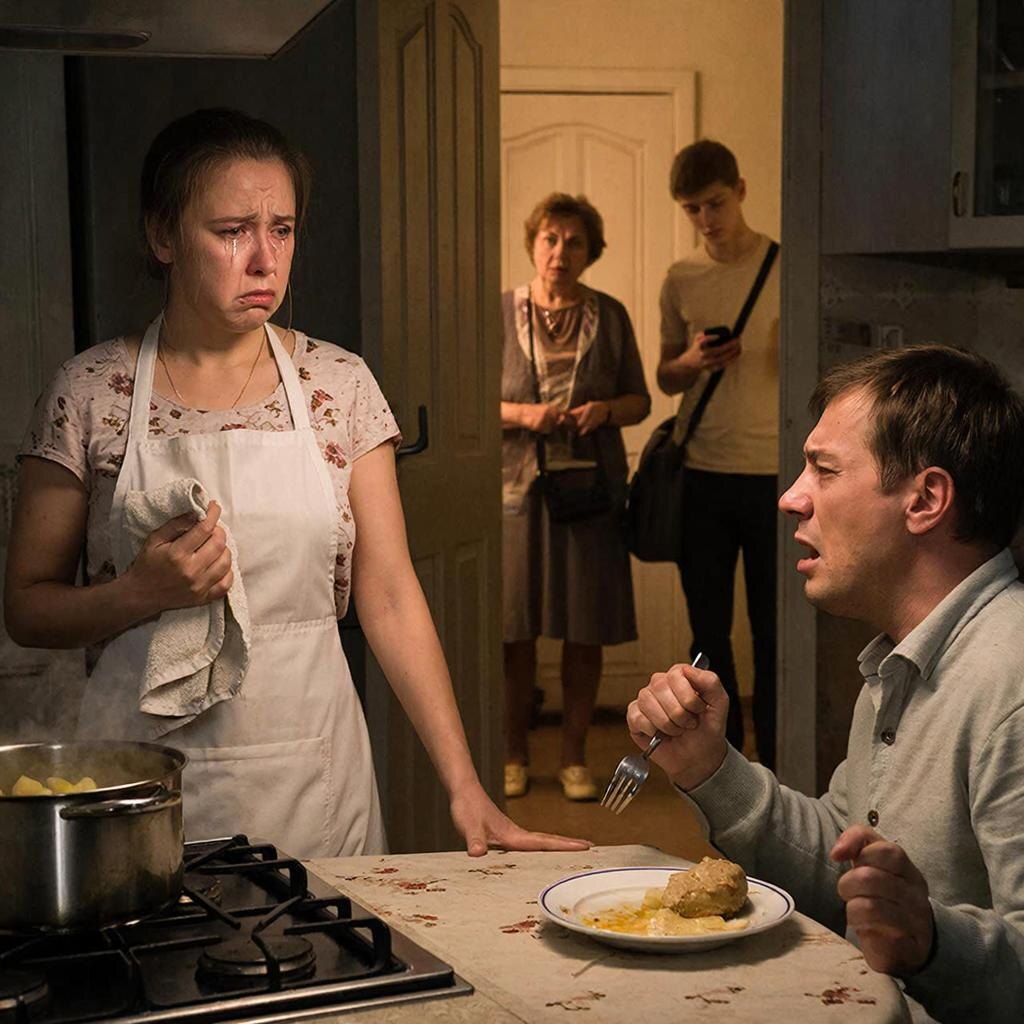 Виталик молча бросил сумку у порога кухни, плюхнулся на свободный стул и уставился в телефон. Тамара Петровна, не снимая пальто, подошла к столу, брезгливо оглядела тарелки.