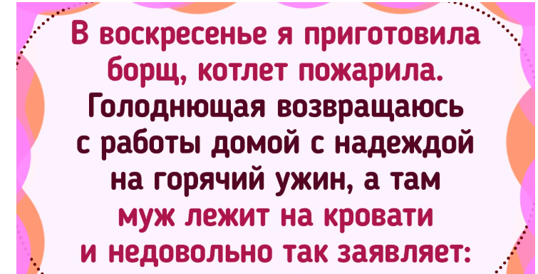 - Расписались мы с мужем в пятницу, а в понедельник у меня первый рабочий день на новой работе. В воскресенье я приготовила борщ, котлет пожарила. В понедельник выхожу на работу — и тут опаньки! — сразу какая-то важная делегация на наш завод. С самого утра и до 10 вечера. Голоднющая возвращаюсь домой с надеждой на горячий ужин, а там муж лежит с книжкой на кровати и недовольно так заявляет: «Почему так долго? Я тут в обед еще все съел, лежу голодный, а ты гуляешь где-то. Готовь давай!». Сказать, что я офигела — это ничего не сказать. Оказалось, что у человека штамп в паспорте стал точкой резкого поворота в отношениях: «У меня же теперь жена есть, почему я должен что-то по дому делать? Не для того женился!» © TegraNe