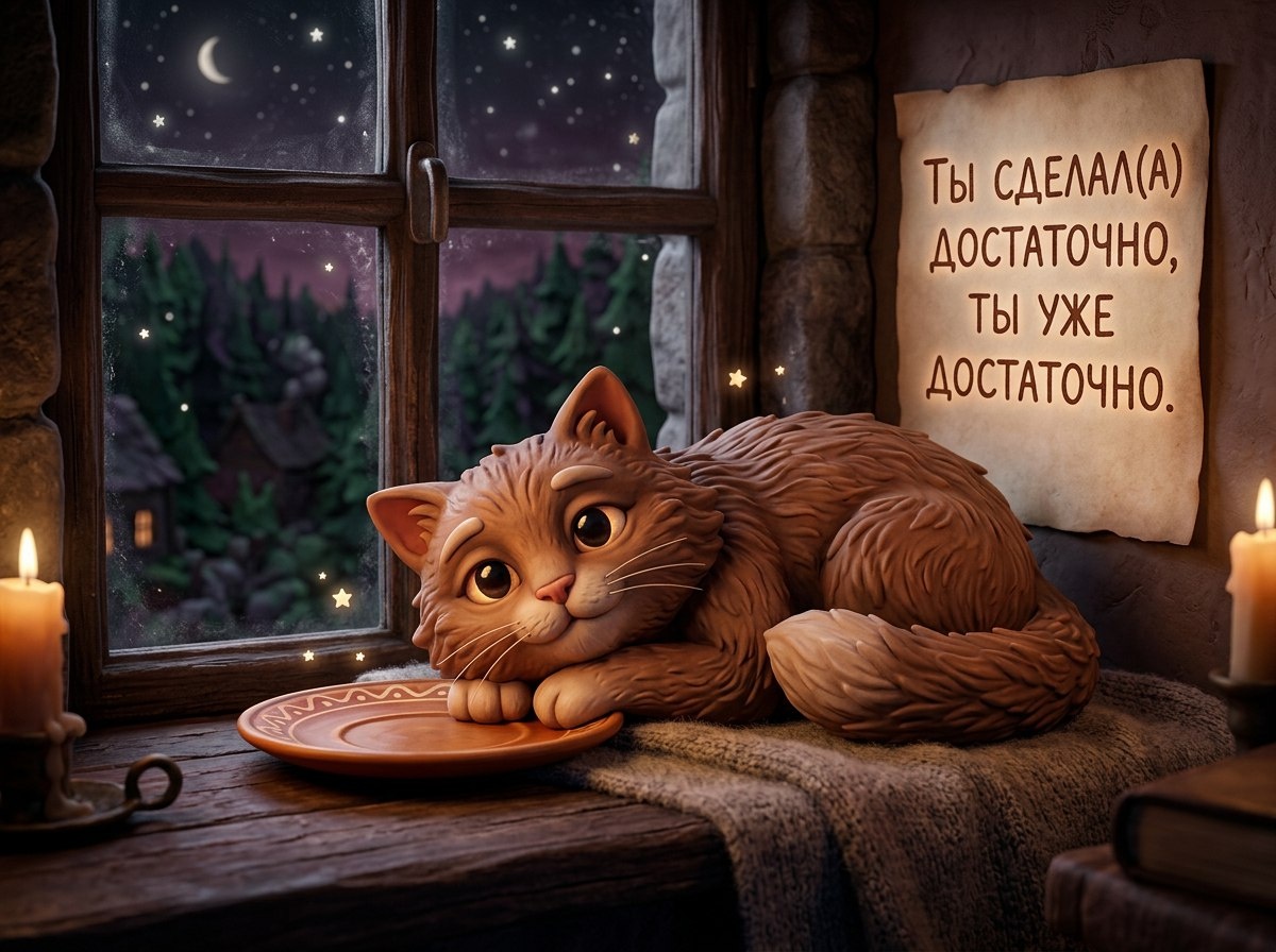 Всё важное сегодня случилось, даже если кажется иначе. Вечер накрывает мир мягким пледом сумерек, и ты имеешь право остановиться, выдохнуть и доверить остаток забот тихой ночи. Посмотри внутренним взглядом: как звёзды за окном загораются одна за другой, так и в тебе вспыхивают маленькие огоньки понимания и опыта. Ты сделал(а) достаточно, ты уже достаточно. Позволь себе устроиться поуютнее в этом мгновении, как я устраиваюсь на тёплом подоконнике, слушая шёпот ветра. Пусть сон придёт мягко, словно бархатная лапка, приглаживающая беспокойные мысли. Ночь бережно охраняет твой покой, а завтрашний день дождётся тебя терпеливо. Сейчас твоя единственная задача — отдыхать, наполняясь тишиной, уверенностью и тихой, светящейся изнутри надеждой.
