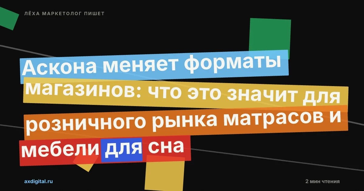 Аскона меняет форматы магазинов: что это значит для розничного рынка матрасов и мебели для сна «Когда федеральный игрок начинает играть с форматом — значит, текущий перестал отбивать аренду. Всё остальное — маркетинг.» «Аскона» анонсировала тест новых торговых форматов в 2026 году: от 600 до 3000 кв. м. Диапазон широкий — и это само по себе говорит о том, что компания ищет оптимум, а не масштабирует готовое решение. Для конкурентов и арендодателей сигнал очевидный. По данным компании, в 2026 году «Аскона» планирует пилотировать торговые точки разной площади — от компактных 600 кв. м до крупных 3000 кв. м. После успешного теста форматы появятся в других городах России. Конкретные локации, бюджет на открытие и целевое количество точек не раскрывались.