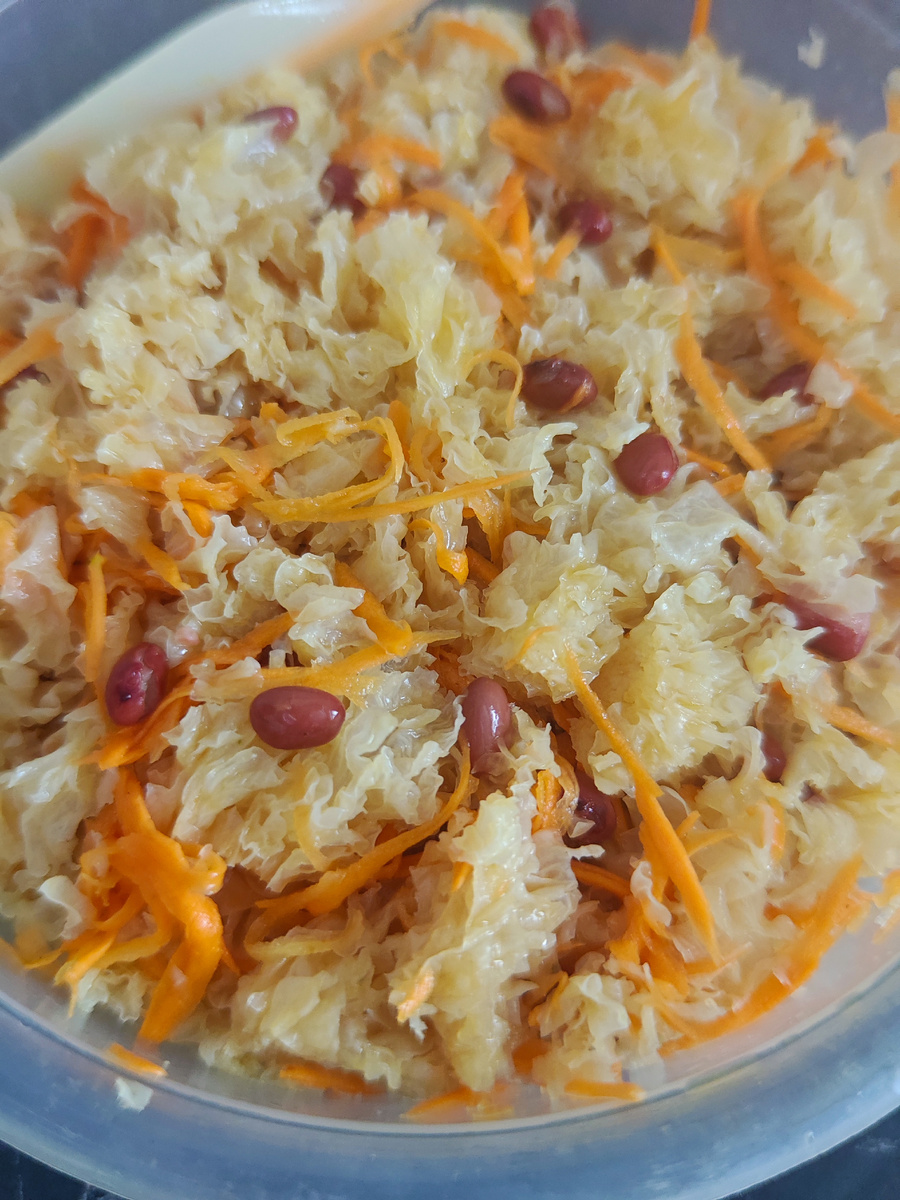 Как и время приготовить. Собственно, сегодня и пополняла запасы готовой пищи. Маринованный лук, корейская морковка, запеченная курица, вот предъявлю салат оригинальный: древесные грибы (тремелла), морковь, фасоль, соево-лимонная заливка.