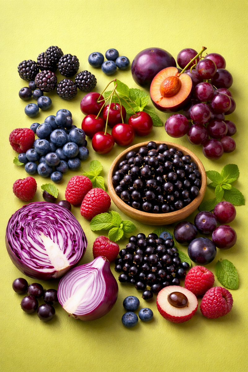 Когда мы говорим о здоровом питании, часто вспоминаем витамины, белки и минералы. Но есть еще одна группа веществ, которые играют важную роль в защите организма — растительные пигменты. Особенно интересны антоцианы — вещества, которые придают ягодам, фруктам и овощам насыщенные фиолетовые, синие и темно-красные оттенки. Их ценность не только в цвете. Исследования показывают, что эти соединения могут защищать клетки от повреждений, поддерживать здоровье сосудов и даже помогать организму справляться со стрессом. Антоцианы — это природные соединения из группы полифенолов, которые выполняют в растениях защитную функцию. Они окрашивают растения в разные оттенки: Интересно, что цвет антоцианов зависит от кислотности среды (pH): Поэтому один и тот же пигмент может окрашивать разные плоды в разные оттенки. В разных продуктах эти вещества распределены по-разному. В некоторых плодах антоцианы находятся только в кожице, например: А в других — и в кожице, и в мякоти: Именно поэтому такие ягоды и