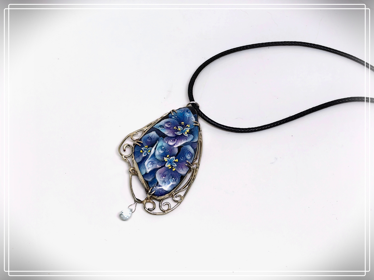 Кружево оправы видно и с "лица" кулона. Тонкий ободок оправы и маленькие "лапки" надежно фиксируют камень, украшенный цветущий гортензией. А маленькая капелька голубого топаза завершает композицию