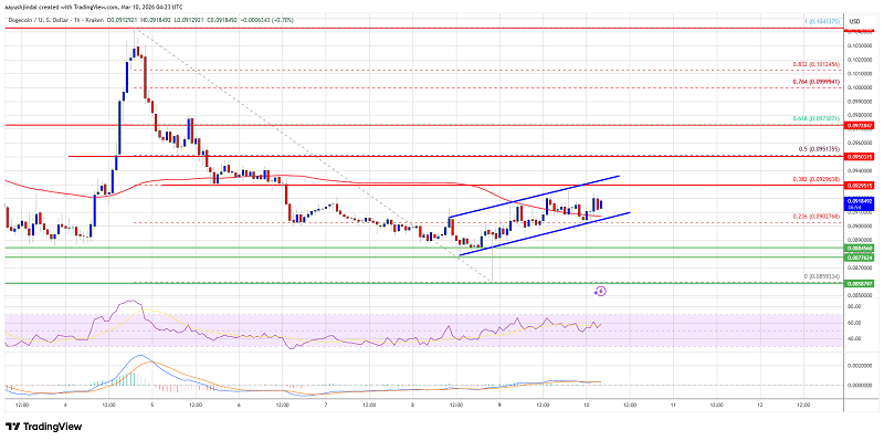 Цена Dogecoin начала формировать волну восстановления от зоны $0,0860, следуя общей динамике рынка криптовалют, где ранее рост продемонстрировали Bitcoin и Ethereum. В ходе восходящего движения актив смог преодолеть уровни сопротивления $0,0880 и $0,0900, что свидетельствует о постепенном усилении покупательского интереса. На графике также наблюдалось уверенное движение выше 23,6% уровня коррекции Фибоначчи, рассчитанного от нисходящего импульса между максимумом $0,1043 и минимумом $0,0859. Тем не менее, вблизи отметки $0,0925 продавцы остаются активными и продолжают оказывать давление на цену. Дополнительно на часовом графике торговой пары DOGE/USD формируется восходящий канал, ключевая поддержка которого расположена на уровне $0,0904. В настоящее время цена торгуется выше отметки $0,0900, а также выше 100-часовой простой скользящей средней, что может рассматриваться как умеренно позитивный сигнал для рынка. В случае продолжения восстановительного движения ближайшее сопротивление нахо