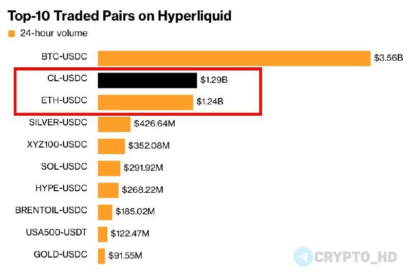 🛢 Bloomberg: Нефть обогнала ETH по объему торгов на Hyperliquid – $1,29b против $1,24b за 24 часа.