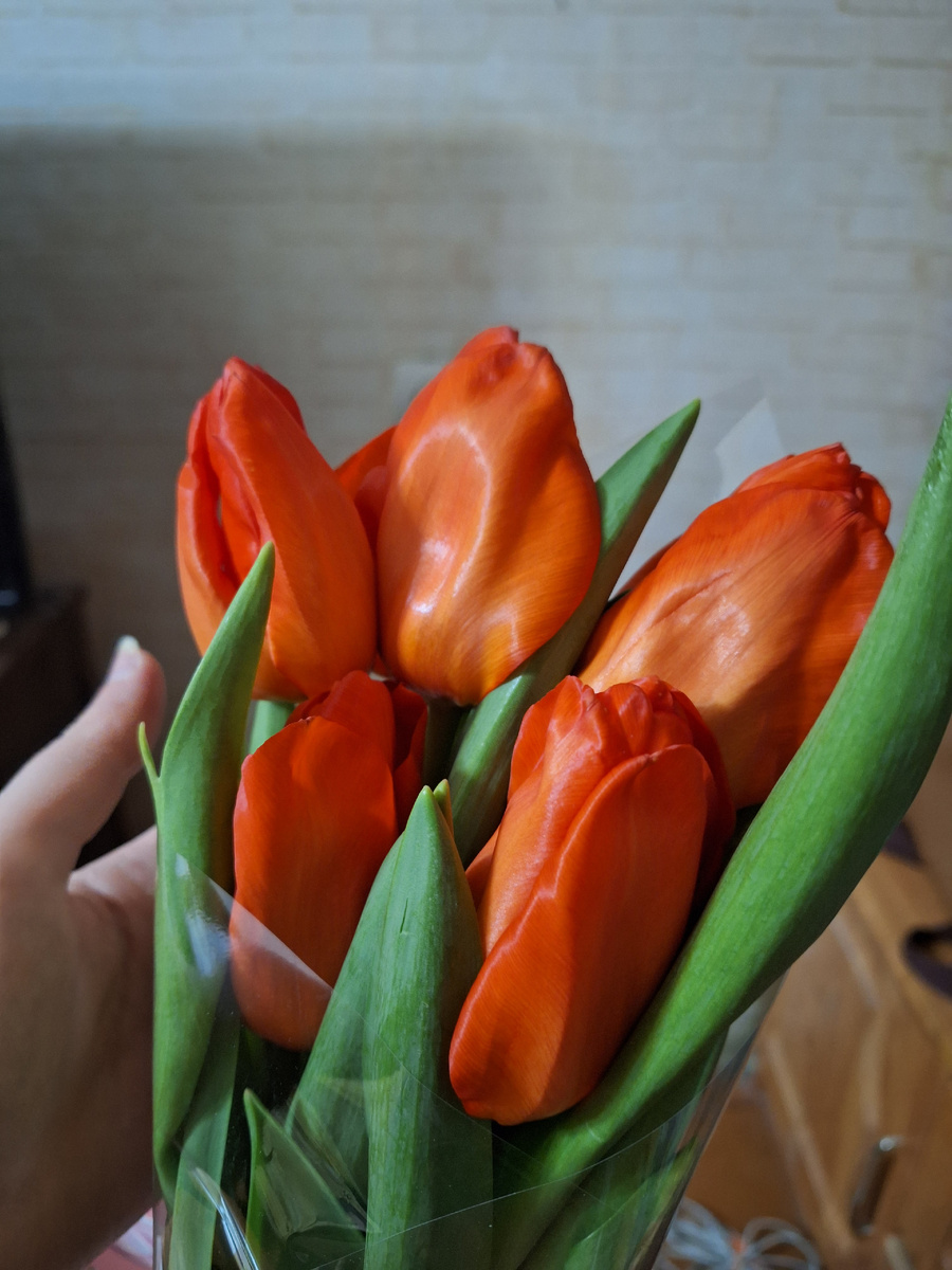 Нас с напарницей часов в 16.00 порадовали букетами тюльпанов. Приятно, даже крылышки за спиной выросли. Моешь посуду и смотришь на букет- красота! И от руководства подарочный сертификат на 1 тыс в лэтуаль подарили. Говорили, что такой тяжёлый день персонал давно не видел. А мы его, т.е. этот день, победили!