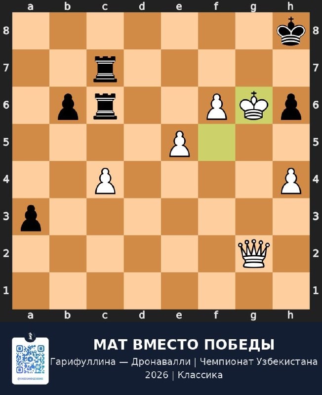 Гарифуллина — Дронавалли 🏆 Чемпионат Узбекистана 2026 | Мастерс | Тур 2 📐 Анти-Берлин (C65) Что произошло: ▪️ Гарифуллина строит мощную атаку на королевском — Кf5, Фh5, пешки g4+f4 ▪️ Харика зевает 30...Лef7?? — оценка прыгает до +6! ▪️ Белые отвечают зевком 33.Фf4?? вместо решающего f6 ▪️ Эндшпиль: ферзь vs 2 ладьи, белые +3... техника 💀 А потом ход 57: Компьютер: «Мат в 14 для белых» Гарифуллина: 57.Крg6?? Компьютер: «Мат в 11 для ЧЁРНЫХ» Один ход. От форсированного мата до поражения. 57...Лg7+ — и белый король в матовой сети. 📖 Полный разбор: lichess.org/study/K3IGgk2c/bzAc9vUW #шахматы #chess #blunder #checkmate #uzbekistan #womenchess #CHESSANDLESSONS