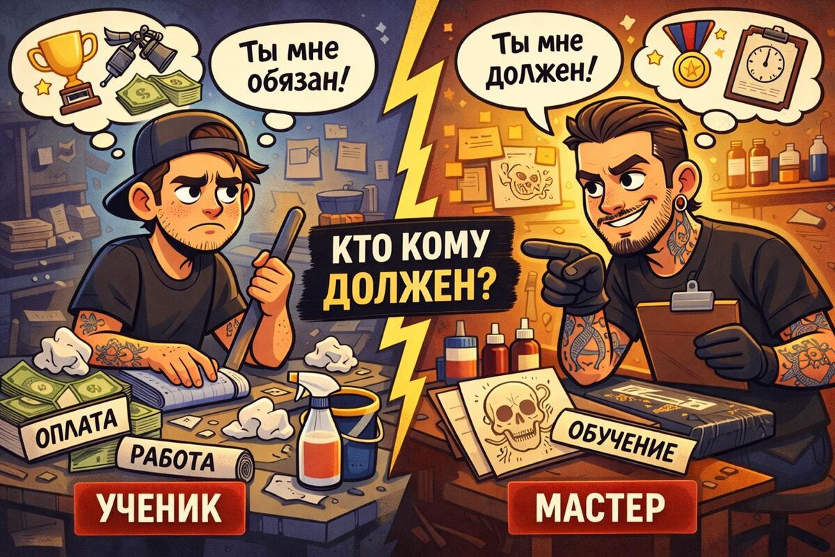 В тату-индустрии этот конфликт вечный. Одни говорят: «Я дал знания — ты мне обязан». Другие отвечают: «Я плачу/работаю — ты мне должен». И именно здесь ломаются ожидания, отношения и карьеры. Давайте честно. Мастер не обязан делать из ученика звезду. Он может дать базу, опыт, безопасность, мышление и доступ к среде. Всё остальное — работа самого ученика. Талант, дисциплина и характер не передаются по рукам. Но и ученик не бесплатный ресурс. Если он платит деньгами, временем или работой — он имеет право на структуру, внимание и честную обратную связь. Не на унижение, не на «смотри и молчи», не на бесконечное ожидание «когда ты будешь готов». Проблема в том, что обе стороны часто врут сами себе. Мастера ждут благодарности и лояльности на годы вперёд. Ученики ждут быстрых результатов и постоянной поддержки. А правда в том, что никто никому ничего не должен сверх договорённостей. Есть рамки. Есть условия. Есть срок обучения. Всё, что дальше — выбор. Хороший мастер учит не завис