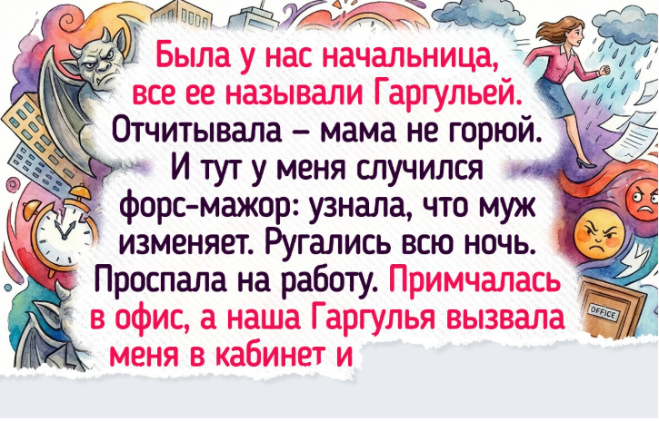 - Была у нас начальница, все ее называли Гаргульей. Отчитывала — мама не горюй. И тут у меня случился форс-мажор: узнала, что муж изменяет. Ругались всю ночь. Проспала на работу. Примчалась в офис, а наша Гаргулья вызвала меня в кабинет и указывает на кресло: «Вижу, что-то случилось, рассказывай». Ну, я не выдержала, разрыдалась и рассказала ей, что у меня на душе. Она молча слушала, строго на меня смотрела, а потом говорит: «Милая, я через это проходила. Поверь, пройдет время, и ты этого Ромео забудешь, как страшный сон. Езжай домой и отдохни. И никогда больше не плачь из-за людей, которые не ценят тебя». Тогда я взглянула на нее другими глазами. Благодарна этой женщине по сей день. Не «Гаргулья» она, а просто строгий руководитель.