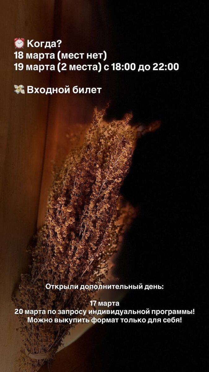 ! Его знают за индивидуальный подход и уникальные процедуры, которые создают атмосферу абсолютного расслабления. А теперь вы можете побывать на эксклюзивной программе с ним в бане «Верба». Что вас ждёт: Три коллективных парения. И каждому гостю — индивидуальное парение. Полноценная работа с телом. Первый медовый пар Прополисные положки. Донник жёлтый. Липовый цвет. Ванночки для ног с горчицей и пихтой. Прогрев плотный, обволакивающий. Второй пар Термоингаляции солью с цедрой апельсина и лимона, кристаллик ментола. Охлаждение льдом на основе зелёного чая с календулой и ромашкой. Очищение кожи солью с цитрусовым соком. Отдых в чане. Индивидуальные парения Проливки. Охлаждение головы. Контрасты прямо на полке. Финальный общий прогрев на ярком аромате. ☘️Чайный стол с банными комплиментами и текстиль предоставляем! 📅 Когда? 18 марта мест нет 19 марта 2 места 17 марта дополнительный день с 18:00 до 22:00 Стоимость входного билета: 8.500₽ Количество участников: 6 Брон