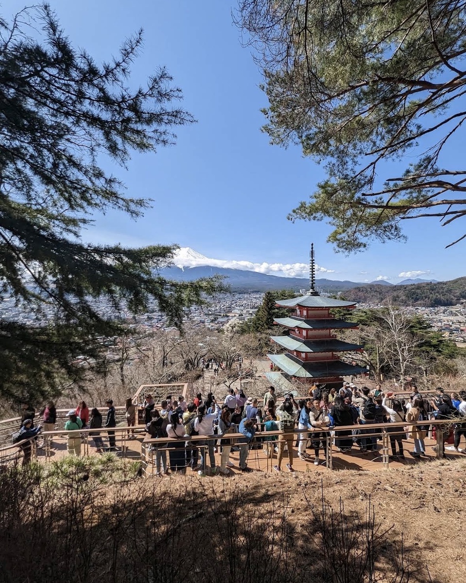 Около озера Кавагутико или у пагоды Чурейто иногда выстраиваются очереди из желающих сделать кадр. Вот например толпа народу у небольшой площадки пагоды Чурейто, жаждущая сделать заветную фотографию.