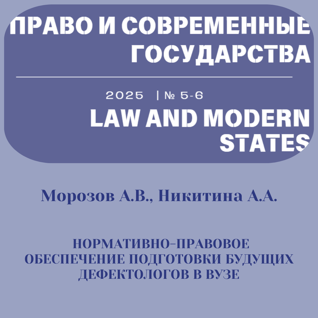 Представляем публикации 5-6 номера 2025 года Журнала «Право и современные государства» НОРМАТИВНО-ПРАВОВОЕ ОБЕСПЕЧЕНИЕ ПОДГОТОВКИ БУДУЩИХ ДЕФЕКТОЛОГОВ В ВУЗЕ Морозов Александр Владимирович – доктор педагогических наук, профессор, главный научный сотрудник НИИ ФСИН России, email: doc_morozov@mail.ru Никитина Анастасия Александровна – заместитель декана факультета коррекционной педагогики и специальной психологии Московского социально-педагогического института, email: anastasia_nikitina_mspi@mail.ru УДК 37.014 ННС 5.1.4 Аннотация: перспективы развития дефектологической науки и практики неразрывно связаны с качеством подготовки специалистов по направлению 44.03.03 «Специальное (дефектологическое) образование». Роль регулятора в лице государства определена установлением единых образовательных стандартов и контролем за их соблюдением в процессе получения образования. В статье представлены нормативные правовые акты, обеспечивающие стабильное функционирование и совершенствование системы образ