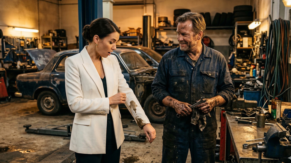 Запах бензина ударил первым – ещё до того, как я вышла из такси. Потом – скрежет металла откуда-то из глубины гаража и радио, хрипящее старую песню, которую я слышала в детстве у мамы на кухне. Я стояла перед вывеской «Автосервис. Ремонт любой сложности» в белом дизайнерском пиджаке и на каблуках, совершенно не подходящих для этого места.