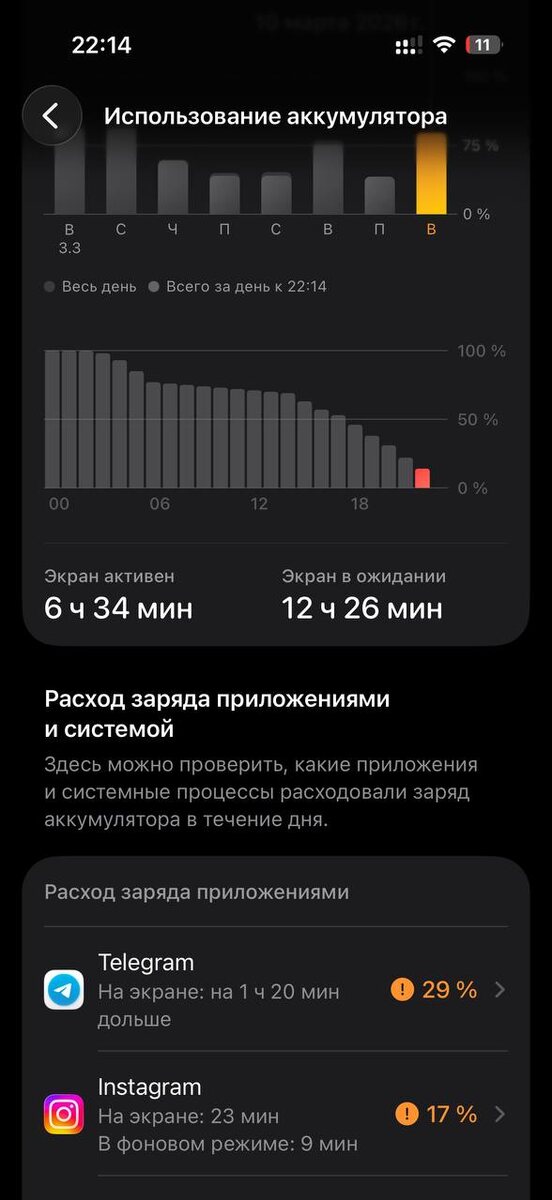 ⚡️Автономность iOS 26.4 Beta 4 Снял с зарядки в 22:27 и активно пользовался до 06:00 утра, а потом с 13:00. В итоге в 22:14 остается 11%. По условиям все стандартно для меня: LTE на двух симках, вайфай/сотовая сеть 50/50 по времени. Яркость 50%. Как обычно соцсети, браузер, ютуб, навигация. Айфон 17 Про, емкость аккума 100%. Always On и 120гц включены. В итоге, если бы довёл тест до конца, также получилось бы около 9 часов экрана. Просто пришлось резко сорваться и нужно было зарядить телефон, а если бы тест был с зарядкой он бы не был правильным. Как у вас?🤔