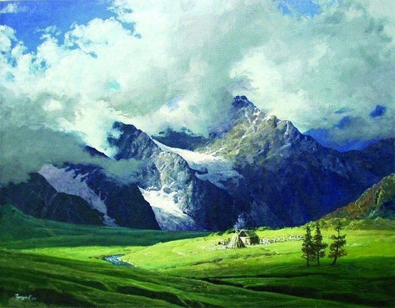 МОЙ НАРОД С телецких гольцов, Сквозь таежные чащи, От рек говорливых, В долине журчащих, Из мира теней Непонятных и тусклых, Из дымных аилов, С порогов катунских, Стекался народ мой. Доверчивый сердцем, Простой и правдивый, С душою чистой. А время стояло... Печально и хмуро Гудели над вечностью Струны топшура. Как льдина весной в половодье Ко льдине — Текли племена, Племена проходили. Прошли и исчезли, Как в паводок лед... Но жив мой народ, Мой алтайский народ! Аржан АДАРОВ Пейзаж Владимира ЧУКУЕВА Перевод с алтайского Ю.ГОРДИНЕНКО #литературагорногоалтая #живописьгорногоалтая