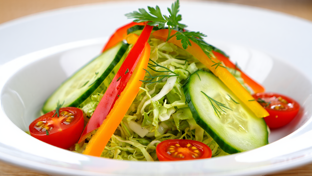 ✨ Этот салат — настоящая находка для тех, кто любит свежие, хрустящие и лёгкие блюда. Без майонеза, без тяжёлых соусов — только натуральные овощи, ароматная зелень и идеально сбалансированная заправка на основе оливкового масла и лимонного сока. 🥒 Секрет салата — контраст текстур: хрустящие овощи, сочные томаты и яркая кисло-сладкая заправка, которая раскрывает вкус каждого ингредиента. Такой салат идеально подходит для обеда, ужина или как лёгкий гарнир. ИнгредиентКоличествоБелокочанная капуста350 гОгурцы свежие250 гПомидоры250 гБолгарский перец180 гКрасный лук80 гСвежая петрушка20 гСвежий укроп15 г ИнгредиентКоличествоОливковое масло40 млЛимонный сок25 млМёд8 гСоль6 гЧёрный перец2 гЗернистая горчица10 г Капусту нашинкуйте очень тонкой соломкой. Добавьте 2 г соли и слегка помните руками 30–40 секунд, чтобы она стала мягче. 👨🍳 Профессиональный совет: