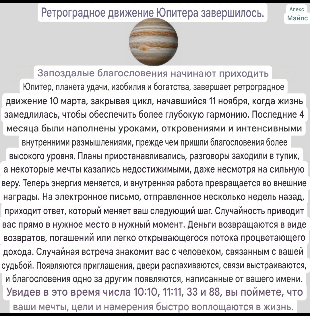 Ретроградное движение Юпитера заканчивается 10 марта, и с этим сдвигом открывается мощная дверь, приглашающая движение, возможности и расширение в те сферы жизни, которые казались замершими или неопределенными.