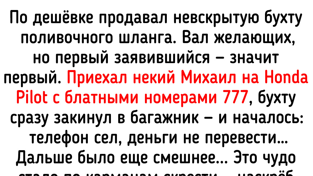 Приехал некий Михаил на Honda Pilot с блатными номерами 777, бухту сразу закинул в багажник — и началось: телефон сел, деньги не перевести… Дальше было еще смешнее... Это чудо стало по карманам скрести — наскрёб 3/4 суммы плюс мелочи. Стыдобища… © Sysanin-44 / Dzen