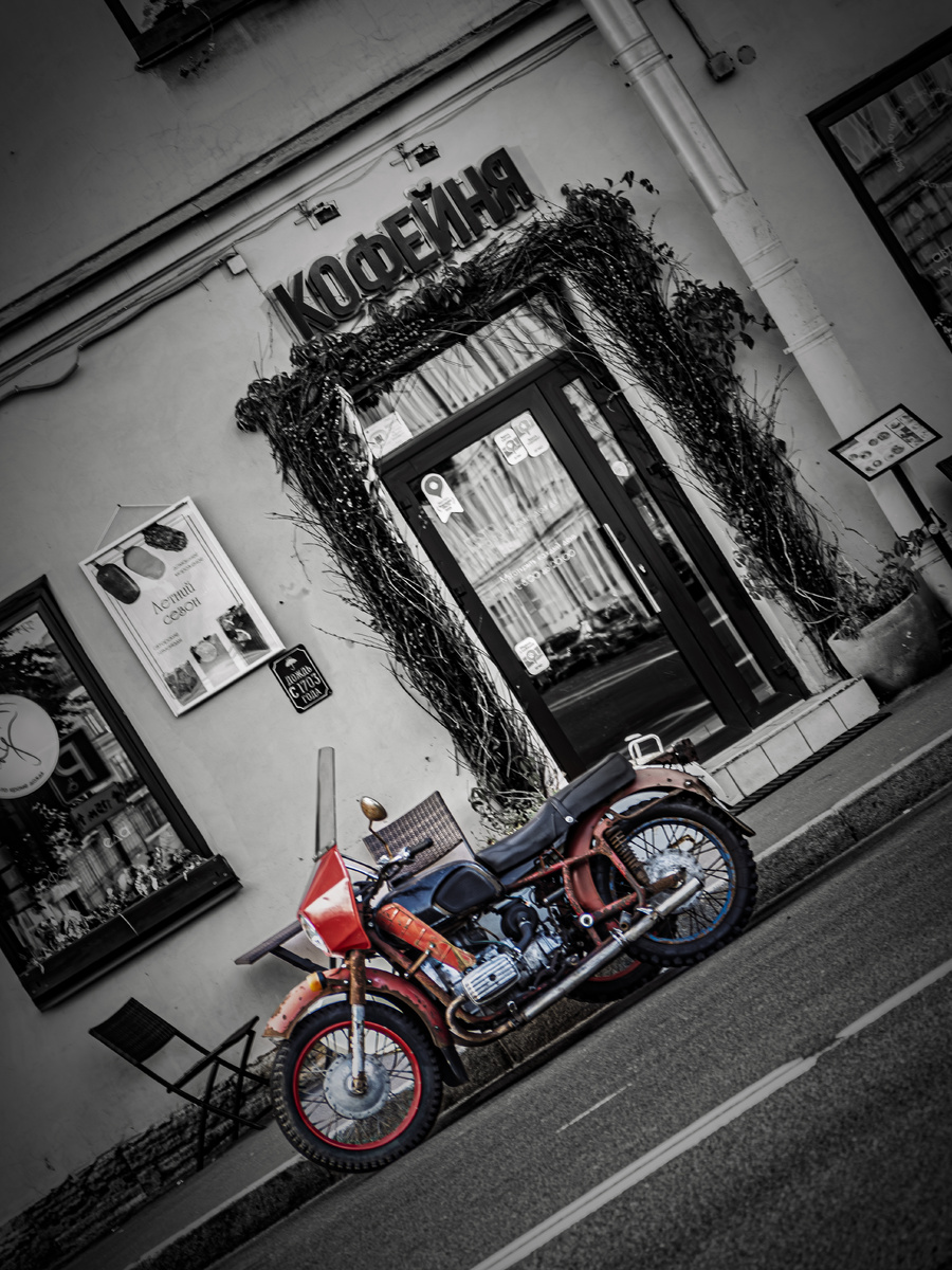 Питерский ветер любит смешивать запахи. Сегодня это была терпкая смесь сырого камня и обжаренных зерен из ближайшей спешелти-кофейни. Мы продолжали наматывать километры по городу, нырнули в очередную арку и тут же расчехлили камеры. Возле входа, густо заросшего влажным плющом, кто-то припарковал старенький советский мотоцикл. Сочный красный цвет на фоне серых питерских стен оказался настоящим визуальным магнитом, пройти мимо было просто невозможно. Но стоило нам вынырнуть из глухого двора-колодца на набережную, как город словно переключил канал с немого кино на блокбастер. Ветер тут же растрепал Насте волосы, пока она разглядывала воду, облокотившись на чугунный парапет. Внизу, под мостами, творился привычный туристический хаос. Катера буквально вспахивали свинцовую воду Грибоедовского канала. Рев лодочных моторов, летящие во все стороны брызги, обрывки фраз из громкоговорителей гидов... С воды город звучит и ощущается совершенно иначе. Мы двинули дальше вдоль русла. У нас с Настей ест