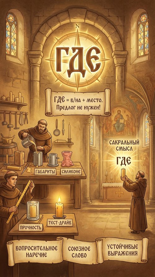 В поисках ответа на вопрос «где сделать заказ на изготовление церковных свечных форм?» мы прошли через все лингвистические лабиринты и вышли на конкретный ресурс. Мы увидели, что слово «где» может быть и картой (вопросительное наречие), и связкой (союзное слово), и указателем, и частью народной мудрости, и даже доменным именем популярной доски объявлений.