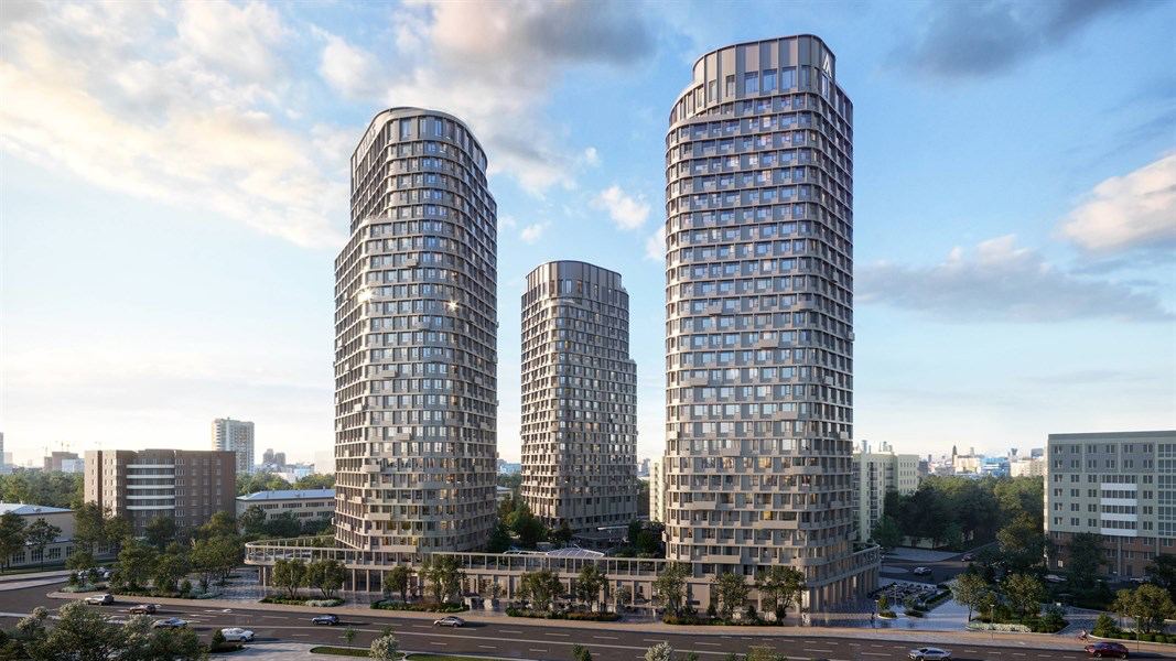 Все три башни стоят на общем трёхэтажном стилобате — это создаёт единый архитектурный ансамбль а не просто три отдельных дома на одном участке. На высоте четвёртого этажа — приподнятый двор полностью изолированный от уличного трафика.