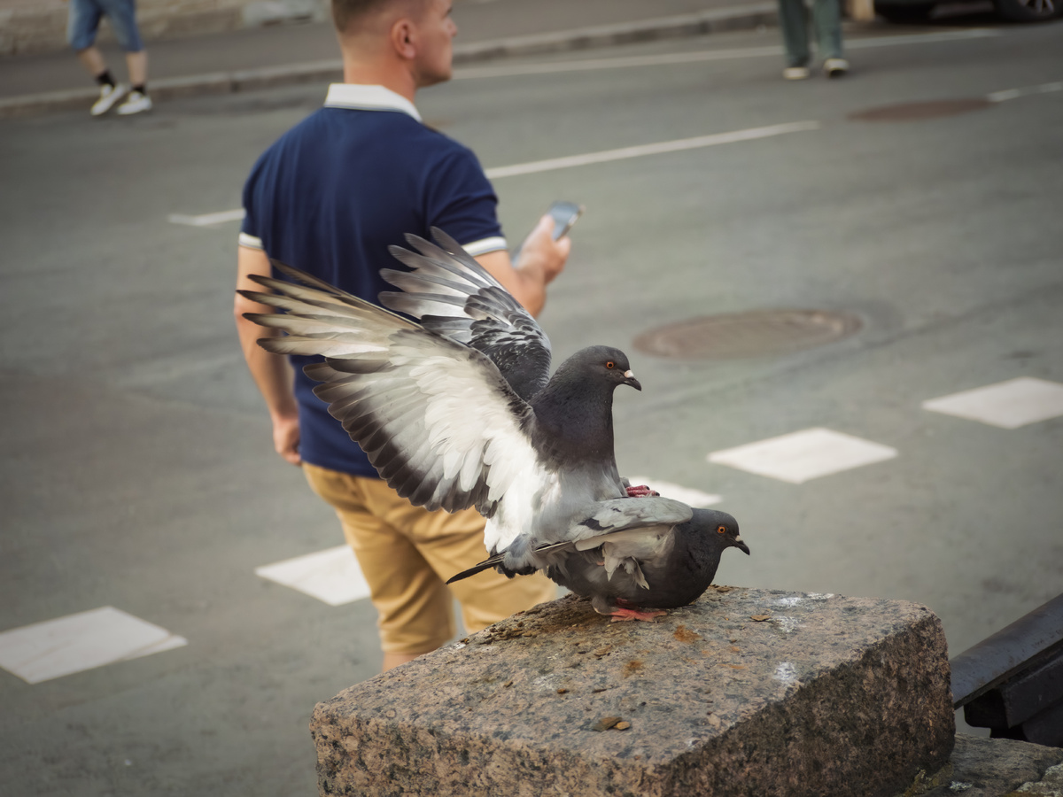 Питер затягивает в себя сразу, с первого шага на улицу 🌧️🏙️ Вдыхаешь этот вечный коктейль из сырой штукатурки и крепкого кофе, а под ногами уже своя драма. Голубь распушил перья и устраивает сцену ревности прямо на мокром граните 🕊️💃 Парню со смартфоном на заднем плане до этого вообще нет дела. Типичное утро ☕ Сворачиваем с Настей на соседнюю улицу, а за стеклами начинается откровенный сюр. В витрине гордо красуется керамическая филейная часть с надписью «PARK ME!» на фоне сухих пальмовых веток 🌴 Кто это придумал? Зачем? Без понятия, но именно за такие нелепые пасхалки я и люблю стрит-фотографию 📸 Ныряем в ближайшую арку. Строгая табличка «Прачечный переулок, 12» еще пытается задавать тон, но стоит пройти чуть вглубь двора, как ровная геометрия рушится 🏚️ Стены-колодцы заваливаются, строительные леса ломают перспективу, а шаги гулко бьются о штукатурку. Тот самый изнаночный, облезлый, живой Петербург 🖤 Только вместо призраков Достоевского из окна первого этажа за нами наблюдают
