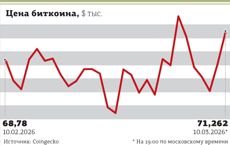 Цена биткоина в последние дни реагировала на новости весьма размашистыми движениями. За прошедшую неделю главная криптомонета успела подорожать до $74 тыс., а потом провалиться ниже $66 тыс. Но в итоге за 7 дней подросла на 6,5%. По данным информационного ресурса Coingecko, 10 марта в 19:00 по московскому времени биткоин стоил $71 262. Эфир по традиции колебался сильнее своего главного конкурента: там разница между минимумом и максимумом за неделю превысила 12%. Но результирующая динамика оказалась ровно той же, +6,5%. Вчера вечером этот актив стоил $2077,09. Совокупная капитализация всех выпущенных криптомонет прибавила за 7 дней 3%, поднявшись до $2,497 трлн. "Неделя со 2 по 8 марта 2026 года стала для биткоина настоящим испытанием на прочность, где геополитика полностью затмила факторы технического анализа, — комментирует управляющий фондом “Майнинг” УК “Рекорд Капитал” Александр Барышников. — Весна началась с восстановления после обвала до $63 тыс. в выходные на новостях об ударе п