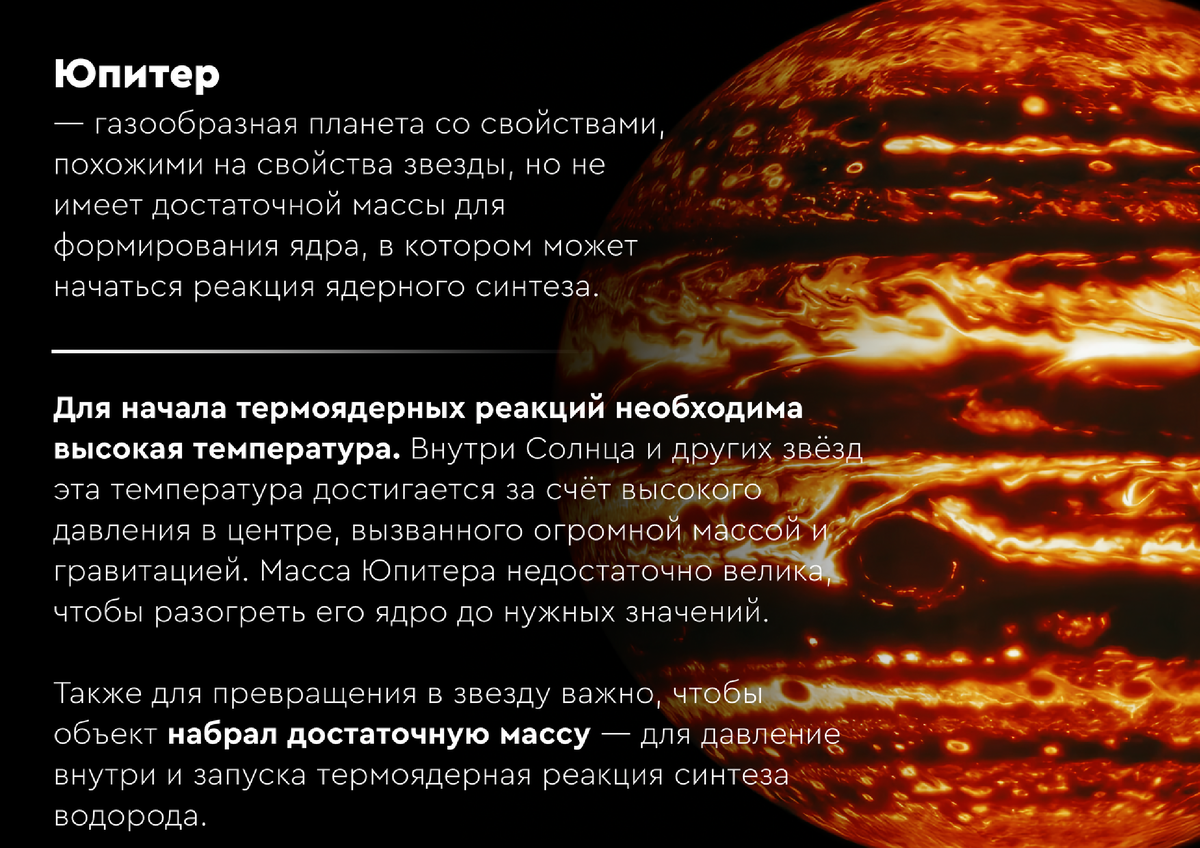 Чтобы в недрах объекта загорелась водородная реакция (превращение обычного водорода в гелий), нужно создать колоссальное давление и температуру в ядре — около 3 миллионов Кельвин. Для этого масса должна быть примерно в 80 раз больше, чем у Юпителя.