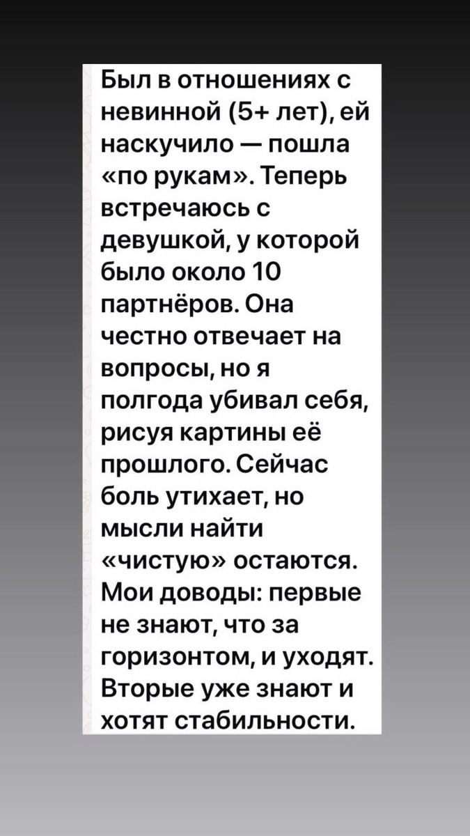 ? Вы прошли через предательство и теперь лихорадочно ищете формулу безопасности: «Если девушка мало с кем была — значит, верна? Если много — значит, ценит стабильность?» Звучит логично. Но ваша собственная фраза выдаёт правду: «Полгода убивал себя, рисуя картины её прошлого». ❗️Зачем вы их рисовали? Эти картинки — не про неё. Это проекция вашей боли и страха, что снова предадут. С точки зрения системной терапии, вы ищете не женщину, а гарантию безопасности, которой у вас, возможно, никогда не было. 🔴 В чём ловушка вашей теории? Вы делите женщин на «тех, кто не знает — и потому уходит» и «тех, кто знает — и потому ценит». Но проблема не в количестве. Есть девушки с малым опытом, которые хранят верность, и с большим — которые продолжают искать. Всё решают не цифры, а личностная зрелость, ценности и умение выбирать. Ваша бывшая «невинная» ушла не потому, что у неё не было опыта. Ушла потому, что не созрела для отношений. А нынешняя честно отвечает на вопросы и остаётся с вами, несмо