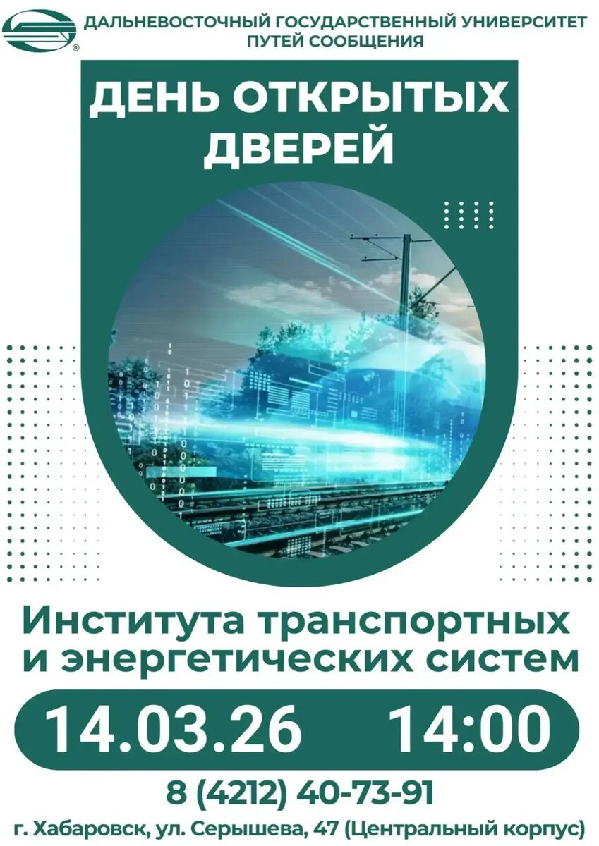 Если вы хотите узнать об образовательных программах, лабораториях, а также немного подготовиться к студенческой жизни, то информация ниже для вас. 🔹Что предстоит? Знакомство с директором Института транспортных и энергетических систем, поговорим о специальностях и студенчестве, а также устроим экскурсию по одному из самых крупных ВУЗов Дальнего Востока 🔹Специальности ИТЭС в областях: 🔸 управление процессами перевозок и логистика 🔸 подвижной состав железных дорог 🔸 машиностроение 🔸 эксплуатация транспортно-технологических комплексов 🔸 Наземные транспортно-технологические средства 🔸 системы электроснабжения, электроэнергетика и электротехника 🔸 разработка информационных систем и программного обеспечения 🔸 информационная безопасность 🔸 автоматика и телемеханика, автоматизированные системы управления технологическими процессами 🔸 телекоммуникации 🔹Мы будем вас ждать: 📍14 марта 2026 ⏰ 14:00 🏠 Хабаровск, ул. Серышева, 47, сбор в холле главного корпуса ДВГУПС
