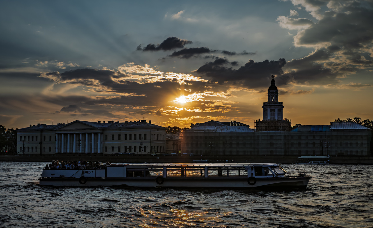 Июль в Петербурге не церемонится. Он накрывает липким зноем и густым, терпким запахом большой воды. Мы с Настей выбрались на набережную в тот самый «золотой час», когда солнце начинает плавить горизонт и превращает все вокруг в янтарную нугу. В этом весь Питер: он выжимает из тебя все соки дневной жарой, но тут же лечит одним взглядом на Неву 🌊. На реке в это время плотнее, чем на Невском. Катер «Алеут» пролетел так близко, что волна едва не лизнула гранитные ступени. Солнце слепило, превращая Кунсткамеру и Академию наук в резкие угольные тени на фоне полыхающего неба ✨. В такие секунды все претензии к толпам туристов и городской суете просто исчезают. Этот свет оправдывает любое неудобство. Тишина здесь - понятие мифическое, да она и не нужна. Только я поймал в объектив идеальный блик, как пространство разорвал рев мотора: мимо пронесся байкер 🏍️. Я сразу понял, что тут нужно только ч/б. Монохром лучше всего передает этот нервный контраст между скоростью японского байка и вековым сп