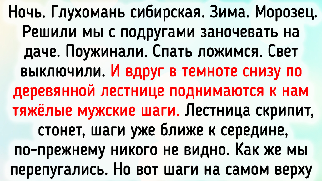 Ночь. Глухомань сибирская. Зима. Морозец. Решили мы с подругами заночевать на даче. Поужинали. Спать ложимся. Свет выключили. И вдруг в темноте снизу по деревянной лестнице поднимаются к нам тяжёлые мужские шаги. Лестница скрипит, стонет, шаги уже ближе к середине, по-прежнему никого не видно. Как же мы перепугались. Но вот шаги на самом верху и на верхней ступеньке появляется довольная морда моего кота, весом 4 кг. Он на нас с таким недоумением посмотрел 😂 © Марина Карнаухова / Dzen