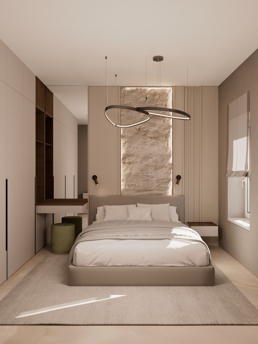 ² 💫Интерьер спальни выдержан в спокойных, натуральных тонах. Светло-бежевый фон подчёркивает игру света и фактур, а деревянные акценты делают комнату уютной. На потолке к дополнению люстры располагается черная трековая система с поворотными спотами, позволяющими акцентировать отдельные зоны комнаты. Лёгкая графическая линия элементов создает акцент на фоне светлого потолка. Вдоль окна установлена встроенная банкетка в цвет стен. Это место- идеальный уголок для наслаждения утренним кофе или размеренного вечернего чтения. https://dzen.ru/id/626cbeeedbc3f92e2abfa411 vk.com/AB_ArtGelika #спальня #ремонт #интерьер #дизайнинтерьера #доммечты #красивыйдом #проектдома #архитектура #дизайн #современныйдом #проекты #проектирование #коттедж #строимдом #загородныйдом #дизайнкоттеджа #дизайндома #строительство #недвижимость