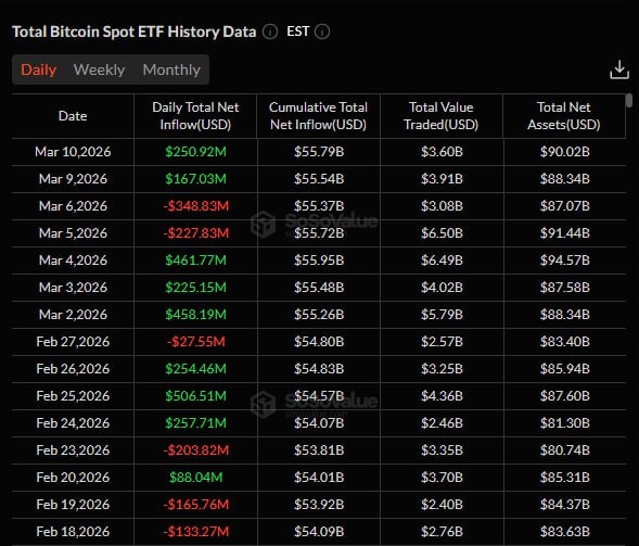 πΈ10 ΠΌΠ°ΡΡΠ° ΠΎΠ±ΡΠΈΠΉ ΡΠΈΡΡΡΠΉ ΠΏΡΠΈΡΠΎΠΊ Π² Π±ΠΈΡΠΊΠΎΠΈΠ½-ETF ΡΠΎΡΡΠ°Π²ΠΈΠ» $251 ΠΌΠ»Π½, ΠΏΡΠΈ ΡΡΠΎΠΌ Π½ΠΈ ΠΎΠ΄ΠΈΠ½ ETF Π½Π΅ ΠΏΠΎΠ»ΡΡΠΈΠ» ΡΠΈΡΡΠΎΠ³ΠΎ ΠΎΡΡΠΎΠΊΠ°