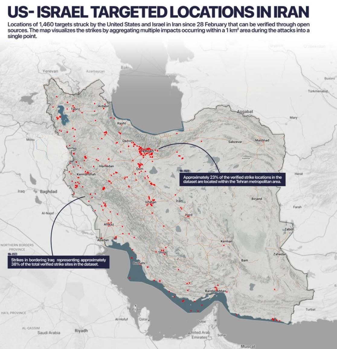 Примерно 23% ударов приходится на окрестности Тегерана, в то время как около 38% сосредоточены вблизи иракской границы, выделяя ключевые зоны давления по всей стране. Подпишись👉🏻 VERDICT