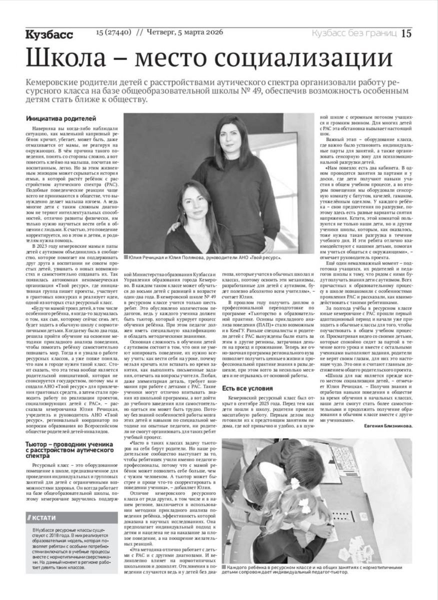 5 марта в газете "Кузбасс" опубликована статья "Школа - место социализации".