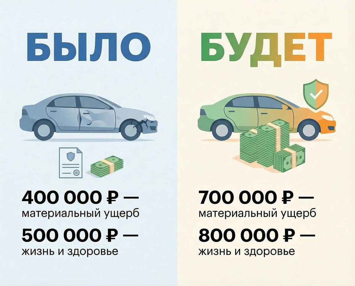 В Госдуму внесли законопроект, который предлагает заметно увеличить выплаты по ОСАГО. 💥 Материальный ущерб — с 400 тыс. до 700 тыс. ₽ 🩺 Жизнь и здоровье — с 500 тыс. до 800 тыс. ₽ Лимиты не менялись с 2014 года, а цены — менялись. За это время средняя стоимость полиса выросла примерно с 1,8 тыс. до 7,5 тыс. ₽ (+284%), а максимальные выплаты остались прежними. Депутаты говорят: в нынешних экономических реалиях этих сумм уже не хватает, чтобы покрыть реальный ущерб после ДТП. Поэтому они предлагают не только увеличить лимиты, но и индексировать их каждый год. Но страховщики уже намекают на обратную сторону медали 👇 📈 Больше выплаты — дороже полис. В отрасли считают, что рост лимитов почти неизбежно приведёт к увеличению стоимости ОСАГО. 📌 Если законопроект поддержат, новые лимиты могут заработать уже с сентября 2026 года. Галина Робертовна - Специалист по страхованию 🍀