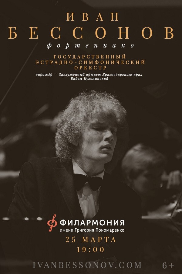 🎹 25 МАРТА В 19.00 погрузитесь в волшебство классики с одним из самых талантливых музыкантов нашего времени! Иван Бессонов - первый российский победитель «Классического Евровидения» и обладатель гран-при Международного юношеского конкурса имени Ф. Шопена! Пианист концертирует с ведущими дирижёрами мира, среди которых Валерий Гергиев и Владимир Спиваков. Его программы собирают полные залы в лучших концертных залах России и за рубежом. 📅 В программе: Фредерик Шопен — Концерт №1 для фортепиано с оркестром, Сергей Рахманинов — Симфонические танцы, ор. 45. На сцене - Государственный эстрадно-симфонический оркестр, дирижёр — заслуженный артист Краснодарского края Вадим Кузьминский ⌛ Продолжительность: 2 отделения по 45 минут с антрактом 🏛БИЛЕТЫ: касса | ул. Красная, 55 сайт | clck.ru/3S2kku