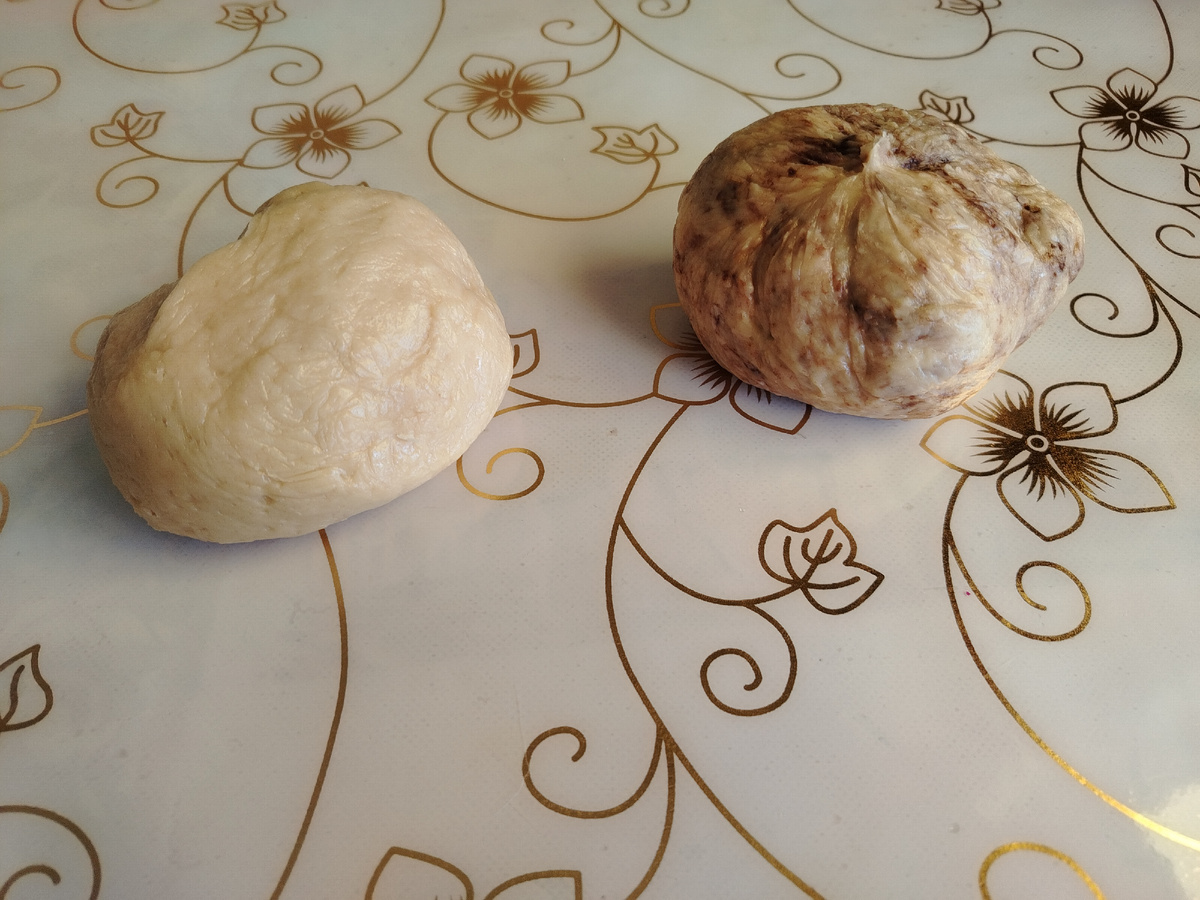 Делим замешанное тесто на две одинаковые части. Одна часть теста у нас останется белой. Во вторую часть теста добавляем какао-порошок.